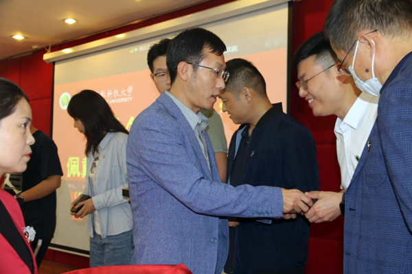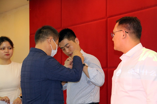随后,在“西农人、西农印”校徽佩戴、名章赠送环节,经济管理学院党委书记张岁平,党委副书记张军驰郑重的为姜海朝、石如玉、冯方雷、董渊、刘正阳、杨强、李光杰、严静妮、税登鸿、韩祥军等十位新生代表,佩戴西北农林科技大学校徽、赠送由西农篆刻协会制作的刻有院训的姓名印章。校徽是学校的重要标志之一,佩戴校徽是学子身份的象征和爱校荣校的具体展现,不仅是一种仪式,胸前佩戴校徽的那一刻,学子与西北农林科技大学就有了千丝万缕的联系并将逐渐融为一体。从此,生命里将深深嵌入“西农印”记。校徽佩胸前,责任担在肩,在惠煜、李光杰、徐真三位同学带领下,全体在场同学和线上同学庄严宣誓:谨记西农校训,热爱祖国,忠于人民;诚信正直,尊师重道;勤奋学习,积极创新;担当责任,追求卓越;以工商管理之学识,成经世济民之英才!
