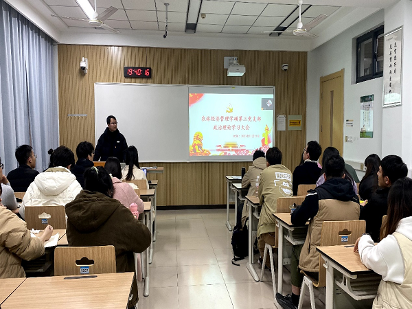 为进一步壮大党员队伍,推进支部建设,11月22日晚,农经学硕三支部在S1207教室召开接收预备党员大会暨政治理论学习大会,支部书记李明主持本次会议。