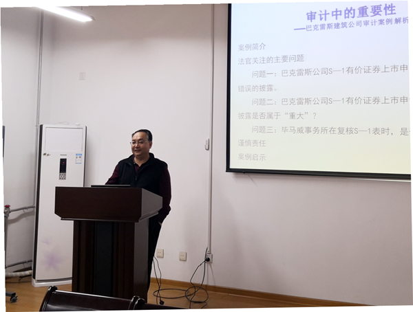 杨文杰老师选取巴克雷斯建筑公司审计案例进行分析,首先对巴克雷斯建筑公司经营业务和财务危机进行介绍,进而从以下三个方面对巴克雷斯建筑公司的案件审理进行分析:(1)判断报表是否有错误;(2)这些错误是否“重大”;(3)毕马威事务所在复核时是否做到了谨慎。通过判断我们得到了如下启示:首先要考虑报表使用者范围,关乎第三者利益;其次,关注重要性;最后审计报告采用比较中性的,有一定幅度的词语。杨老师最后提出未来的财务人员要有良好的职业道德,一旦作假,都是可以被验证的。
