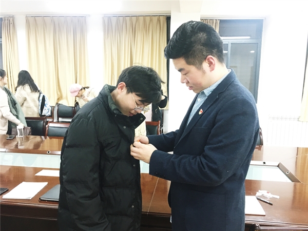 支部书记为新吸收预备党员佩戴党徽